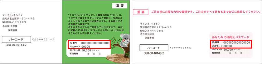 申請手続きは不要です。 出生届の際などに別途申請する必要はなく、対象のお子さまがいるご家庭には、おおよそ出生日または転入月から約2か月以内に案内状が簡易書留で郵送されます。案内状には「ID番号」と「パスワード」が記載されています。